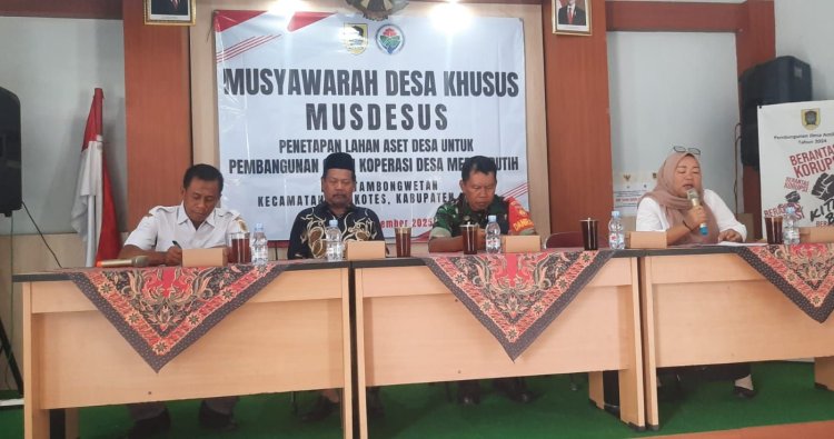 KLATEN — Komandan Koramil 01/Kota Kodim 0723 Klaten, Kapten Cba Budiyono didampingi Babinsa Desa Tambongwetan menghadiri Musyawarah Desa Khusus (MUSDESUS) terkait penetapan lahan pembangunan Gerai Koperasi Desa/Kelurahan Merah Putih (KDKMP) yang diselenggarakan di Aula Balai Desa Tambongwetan Kecamatan Kalikotes Kabupaten Klaten. Kegiatan ini melibatkan unsur pemerintah desa, perangkat kewilayahan, serta tokoh masyarakat sebagai bagian dari proses penguatan pembangunan ekonomi desa. Rabu (03/12/2025)