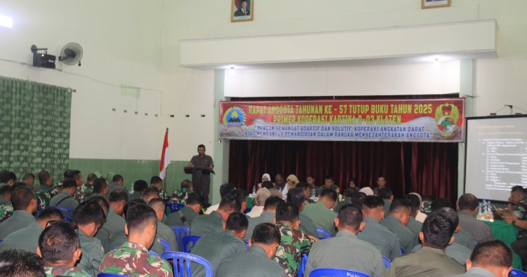 KLATEN – Bertempat di Aula Makodim 0723/Klaten, telah dilaksanakan Rapat Anggota Tahunan (RAT) ke-57 Primkop Kartika D-03 Klaten Tutup Buku Tahun 2025, dengan mengusung tema “Dengan Semangat Adaptif dan Solutif, Koperasi Angkatan Darat Siap Membangun Kemandirian Dalam Rangka Mensejahterakan Anggota.” Kegiatan berlangsung dengan aman dan lancar serta dihadiri oleh para undangan dan anggota koperasi. (11/2/2026)