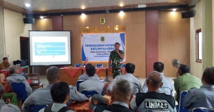 KLATEN — Bati Komsos Koramil 19/Trucuk Kodim 0723/Klaten, Pelda Sulis Karjito yang mewakili Danramil 19/Trucuk menghadiri kegiatan Peningkatan Kapasitas Satuan Perlindungan Masyarakat (Satlinmas) Desa Sajen yang dilaksanakan di Aula Balai Desa Sajen Kecamatan Trucuk Kabupaten Klaten. (13/01/2026).